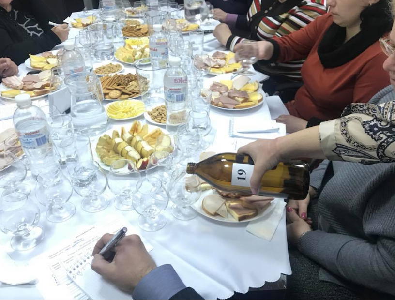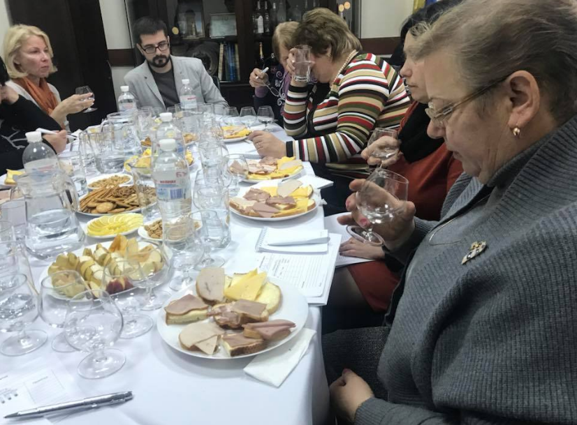 Собравшиеся выставляют оценки этиловому спирту из пищевого сырья. Перед ними на столе, кроме образцов, минеральная вода, бутерброды, печенье и фруктовая нарезка.
