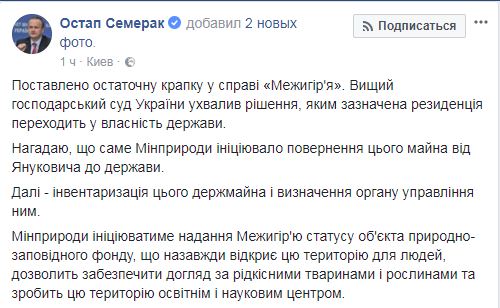 "Поставлена ​​окончательная точка в деле "Межигорье". Высший хозяйственный суд Украины принял решение, которым указанная резиденция переходит в собственность государства", – написал он.
