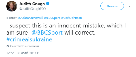 "Подозреваю, что это невинная ошибка, которую, я уверена, BBC исправит. Крым - это Украина", - написала посол.