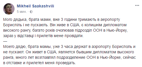 "Моего дядю, брата мамы, уже 3 часа держат в аэропорту Борисполь и не пускают. Он живет в США, является бывшим дипломатом высокого ранга, много лет возглавлял подразделение ООН в Нью-Йорке, сейчас в отставке и прилетел меня проведать",  - написал Саакашвили.