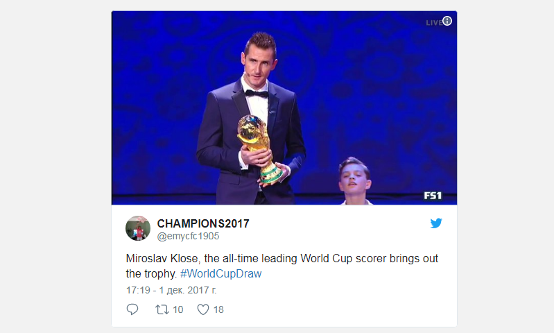 Лучший бомбардир в истории чемпионатов мира по футболу, победитель Мундиаля-2014 в составе сборной Германии Мирослав Клозе показал главный трофей грядущего Чемпионата мира-2018 в России на сцене Государственного Кремлевского дворца. Об этом сообщает RT.