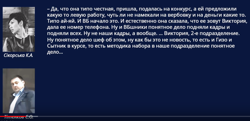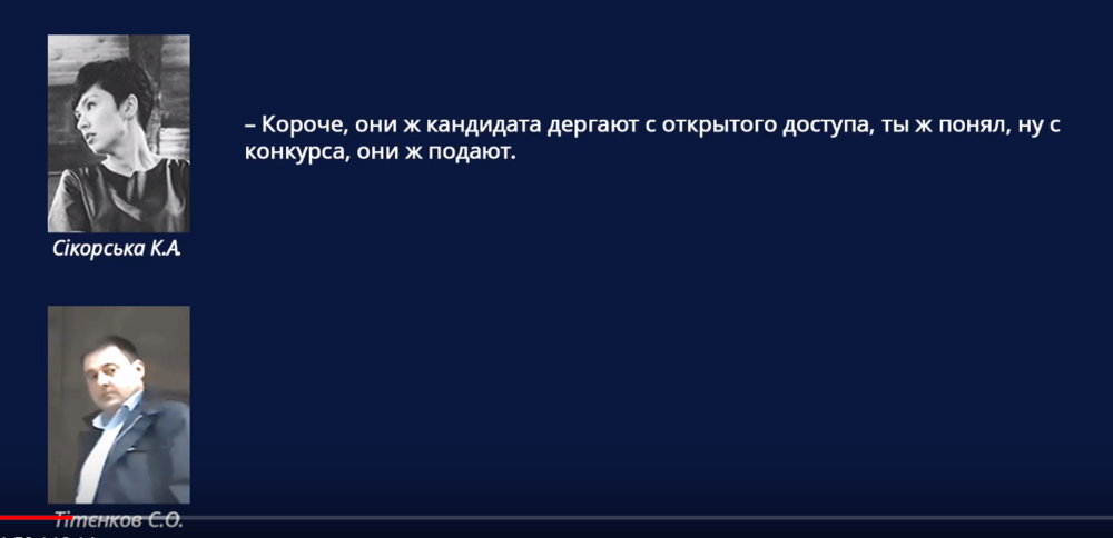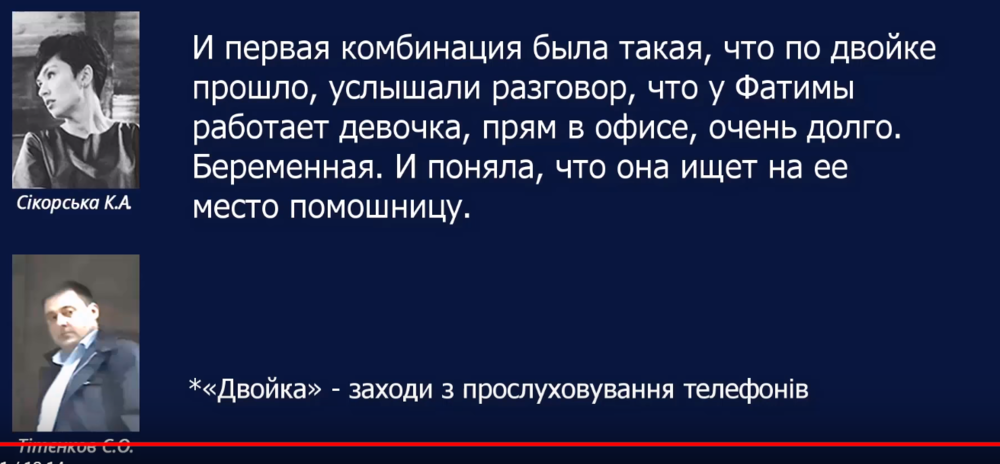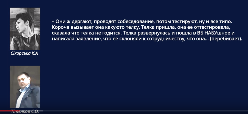В ролике есть прослушка разговора некой Сикорской К.А. с Сергеем Титенковым, которого ведомство Луценко называет агентом НАБУ и который был задержан во время передачи денег Дине Пимаховой.