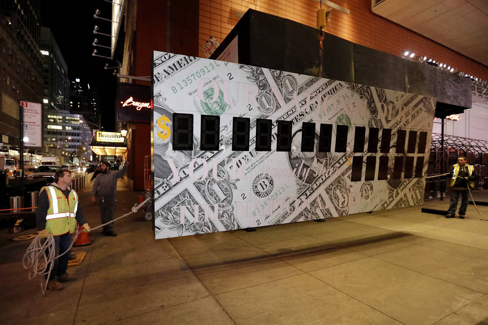В Нью-Йорке, в районе Таймс-сквер вновь появилось табло, напоминающее прохожим об объеме государственного долга США