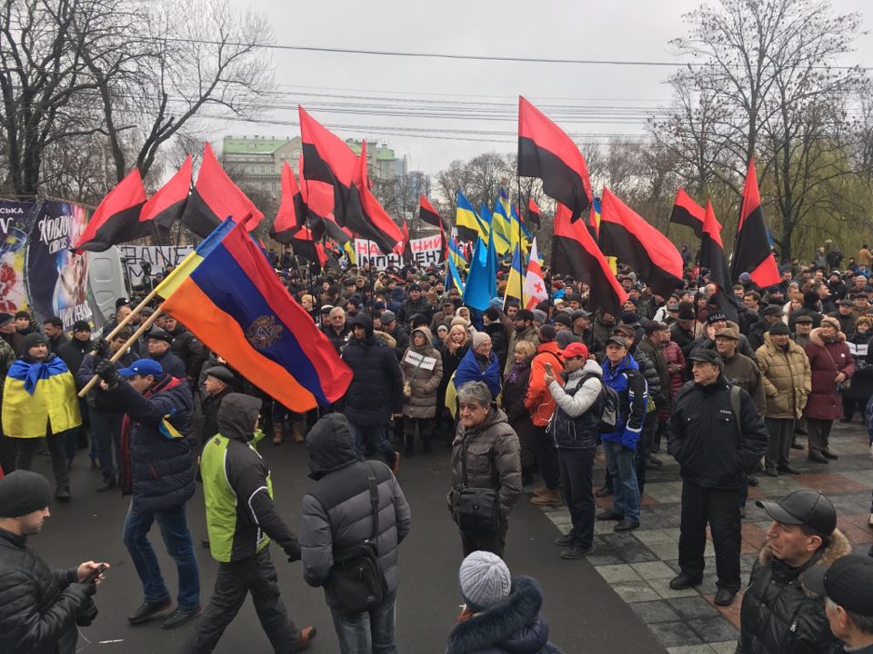 12:09 Сейчас митингующие выстраиваются в колону на перекрестке улицы Владимирской и Проспекта победы. Выйдут через бульвар Шевченко на Крещатик и пройдут до аллеи героев Небесной сотни. А потом пойдут на Банковую к Порошенко.