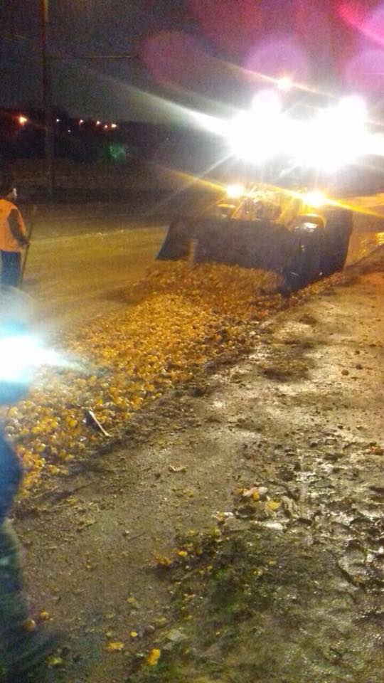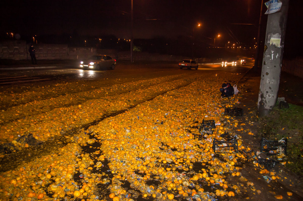 По словам патрульных, на проезде Гальченко произошло ДТП, но участники аварии скрылись с места события, и теперь их разыскивают. Видимо, одним из участников аварии была фура, из которой выпал цитрусовый груз.