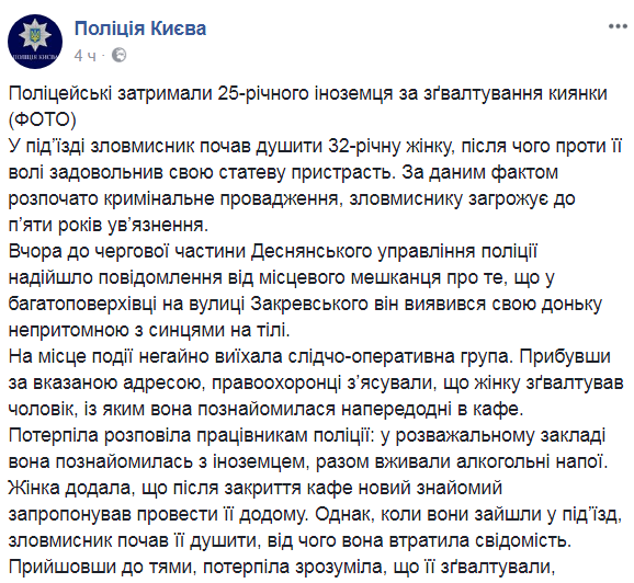 Он начал душить 32-летнюю женщину, после чего против ее воли удовлетворил свою половую страсть. По данному факту начато уголовное производство, злоумышленнику грозит до пяти лет заключения, передают сотрудники Отдела коммуникации полиции Киева.