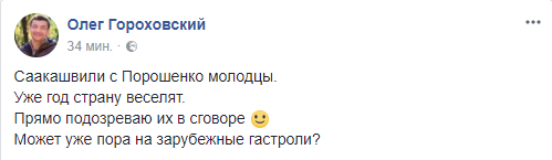 Блогер Олег Гороховский предлагает президенту и экс-губернатору пойти в шоу-бизнес: "Саакашвили с Порошенко молодцы. Уже год страну веселят. Прямо подозреваю их в сговоре. Может уже пора на зарубежные гастроли?"