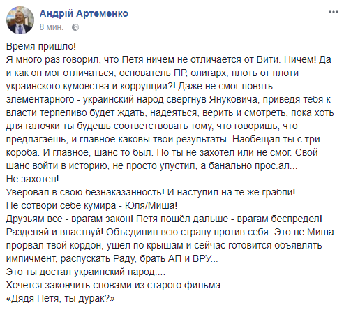"Время пришло! Я много раз говорил, что Петя ничем не отличается от Вити. Ничем! Да и как он мог отличаться, основатель ПР, олигарх, плоть от плоти украинского кумовства и коррупции?! ...