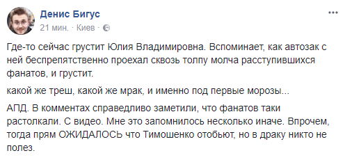 Журналист Денис Бигус напоминает об аресте Тимошенко: "Где-то сейчас грустит Юлия Владимировна. Вспоминает, как автозак с ней беспрепятственно проехал сквозь толпу молча расступившихся фанатов, и грустит. Какой же треш, какой же мрак, и именно под первые морозы...