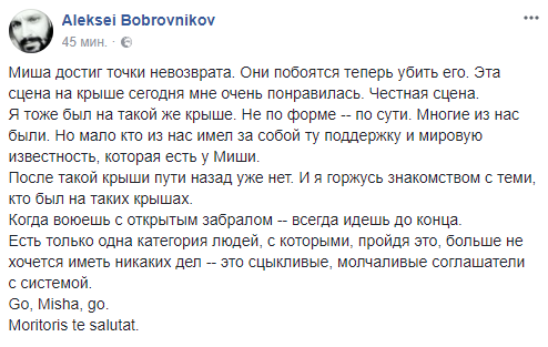 Журналист Алексей Бобровников выступил в поддержку Саакашвили: "Миша достиг точки невозврата. Они побоятся теперь убить его. Эта сцена на крыше сегодня мне очень понравилась. Честная сцена.