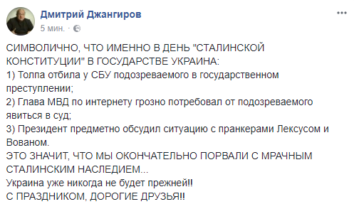 Политконсультант Дмитрий Джангиров усмотрел связь сегодняшних событий с интересной годовщиной: "Символично, что именно в день "сталинской конституции" в государстве Украина: