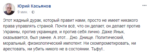 Активист, блогер Юрий Касьянов ругает президента: "Этот жадный дурак, который правит нами, просто не имеет никакого права управлять страной. Почти всё, что он делает, он делает против Украины, против украинцев, и против себя лично. Даже Янык, оказывается, был умнее. А этот... Дно. Днище. Политический, моральный, физиологический импотент. Ни скомпрометировать, ни арестовать, ни убить никого не в состоянии. Тьфу!..".