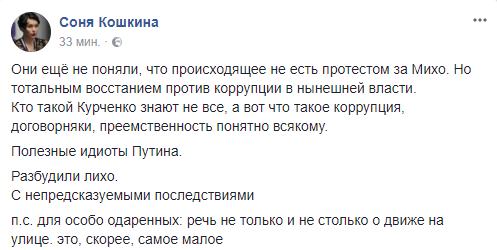 Журналистка Соня Кошкина говорит, что происходящее гораздо глубже, чем протест Саакашвили: “Они ещё не поняли, что происходящее не есть протестом за Михо. Но тотальным восстанием против коррупции в нынешней власти.
