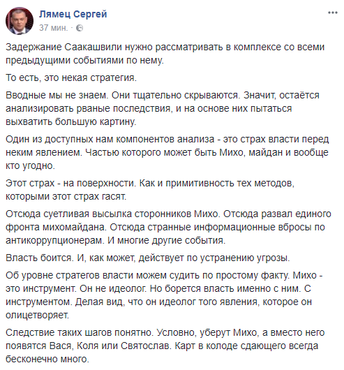 Журналист Сергей Лямец анализирует причины задержания Саакашвили: “…Один из доступных нам компонентов анализа - это страх власти перед неким явлением. Частью которого может быть Михо, майдан и вообще кто угодно.