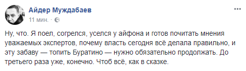 Журналист Айдер Муждабаев: "Ну, что. Я поел, согрелся, уселся у айфона и готов почитать мнения уважаемых экспертов, почему власть сегодня всё делала правильно, и эту забаву — топить Буратино — нужно обязательно продолжать. До третьего раза уже, конечно. Чтоб всё, как в сказке".