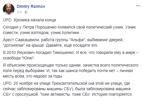 Политтехнолог Дмитрий Раимов пишет, что сегодня у Петра Порошенко появился свой политический узник: “Арест Саакашвили, работа группы "Альфа", выбивание дверей, "догонялки" на крыше. Давайте, ещё посадите его. В 2010 Янукович посадил Тимошенко. И все, что говорили ему в мире – освободи "Юлю".