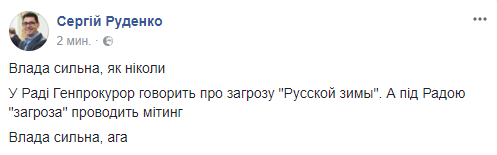 Журналист Сергей Руденко: "Власть сильна, как никогда. В Раде Генпрокурор говорит об угрозе "Русской зимы". А под Радой "угроза" проводит митинг. Власть сильна, ага".