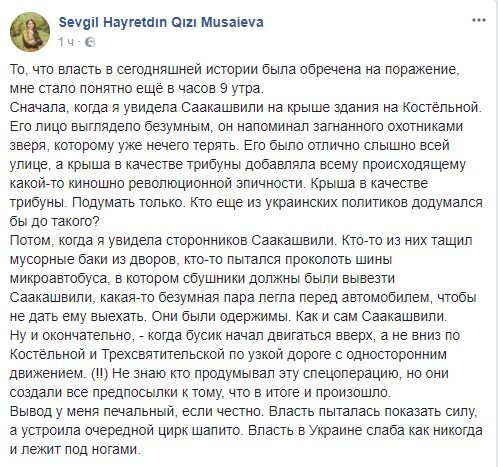"То, что власть в сегодняшней истории была обречена на поражение, мне стало понятно ещё в часов 9 утра. Сначала, когда я увидела Саакашвили на крыше здания на Костёльной. Его лицо выглядело безумным, он напоминал загнанного охотниками зверя, которому уже нечего терять. Его было отлично слышно всей улице, а крыша в качестве трибуны добавляла всему происходящему какой-то киношно революционной эпичности. Крыша в качестве трибуны. Подумать только. Кто еще из украинских политиков додумался бы до такого?