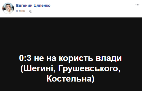 Журналист Евгений Цяпенко напоминает об итогах предыдущих противостояний власти и Саакашвли: "0:3 не на користь влади (Шегині, Грушевського, Костельна)".