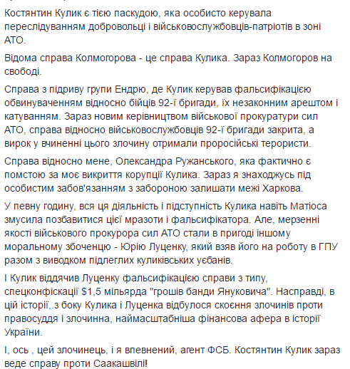 "Именно эту мразоту, лично я, Александр Ружанский, разоблачил в коррупции, проведя расследование его преступной деятельности, которое было положено в основу уголовного производства против него, которое сейчас уже год находится в суде, где я являюсь официальным свидетелем. Константин Кулик, является лицом, который лично, в января 2014 года помогал финансировать титушек Жилина, которые убивали и калечили участников протеста. Это доказанный факт, которым располагает следствие. Константин Кулик является тем лицом,который возглавил и крышевал контрабанду в зоне АТО. Например, установленным факт поставок угля на сумму 100 000 000 гривен фирмой матери Кулика на Укрзализныцю в декабре 2014 года", - заявил Ружанский.