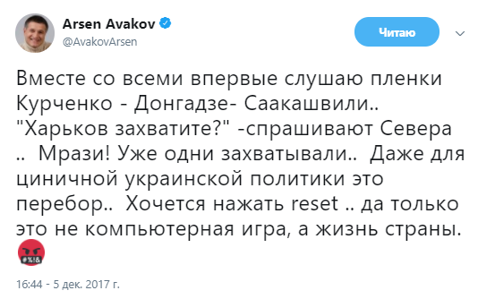 "Вместе со всеми впервые слушаю пленки Курченко-Донгадзе-Саакашвили..."Харьков захватите?" - спрашивают Севера.. Мрази! Уже одни захватывали.. Даже для циничной украинской политики это перебор.. Хочется нажать reset.. да только это не компьютерная игра, а жизнь страны", - написал Аваков.