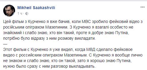 "Этот фильм с Курченко я уже видел, когда МВД сделало фейковое видео с российским олигархом Мазепиным. С Курченко я вообще лично не знаком и слабо знаю, кто он такой, зато я хорошо знаю Путина, нужно было сразу с ним разговор выкладывать", - сообщил он.