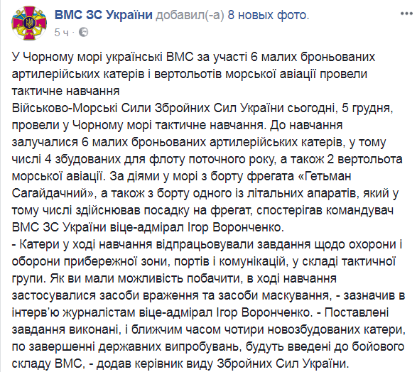 В понедельник, 5 декабря подразделения Военно-морских сил ВСУ провели тактические учения в Черном море. В маневрах приняли участие 6 малых бронированных артиллерийских катеров и 2 вертолета морской авиации.