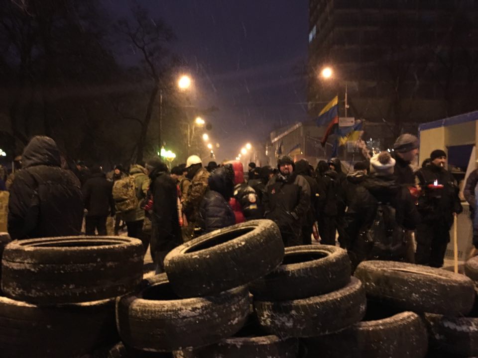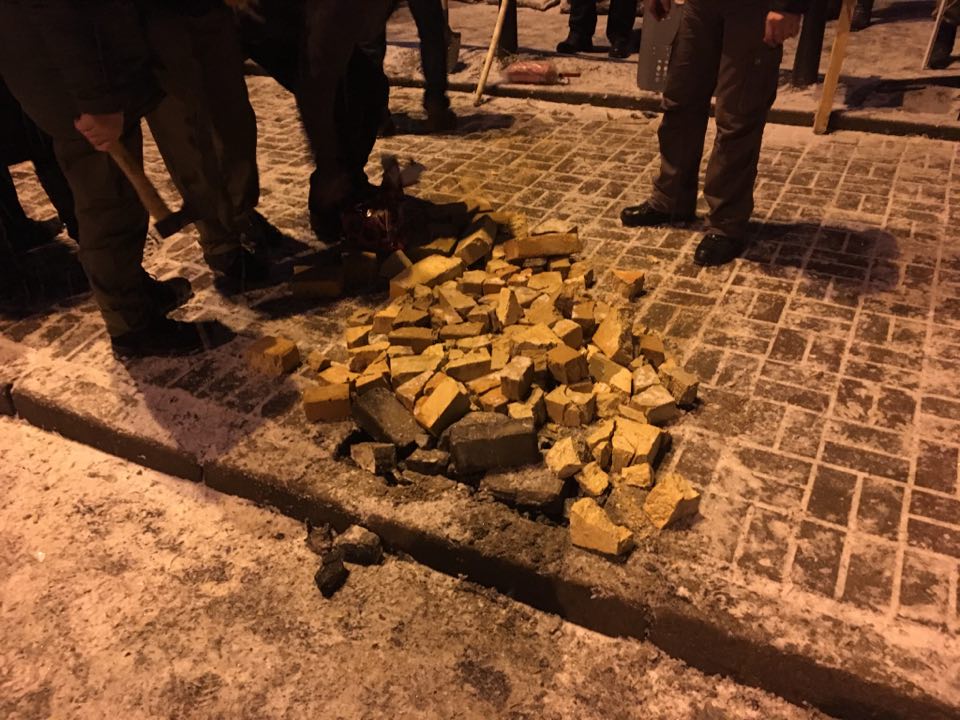 Всего, по словам корреспондента, собралось около 50 человек. Они сложили шины перед баррикадами и насобирали брусчатки.