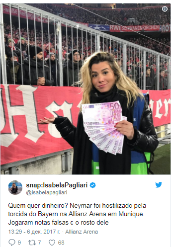 Болельщики Баварии забросали нападающего ПСЖ Неймара в одном из эпизодов матча фальшивыми купюрами достоинством в € 500. Примечательно, что брошенные в сторону бразильца купюры были "именными".