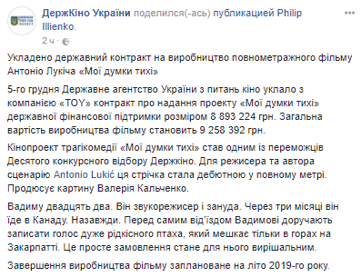 Госагенство по вопросам кино подписало контракт с компанией ТОY на производство полнометражного фильма "Мои мысли тихие". Об этом сообщает пресс-служба Госкино в Facebook.