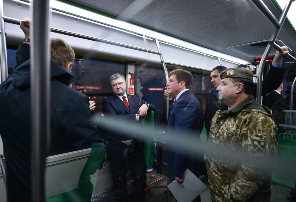 Президент Украины Петр Порошенко, мэр Львова Андрей Садовый и председатель правления концерна "Электрон" Юрий Бубес совершили совместную поездку на первом и пока единственном в Украине общественном электробусе. Об этом сообщает Zik.