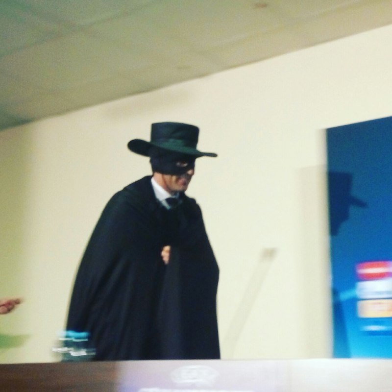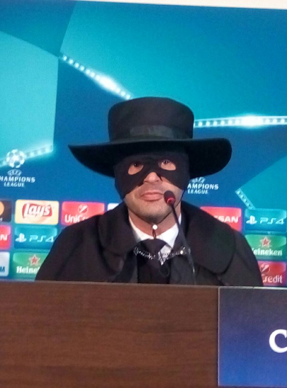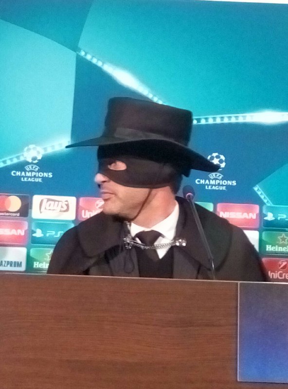 Таким образом он выполнил обещание, данное журналистам 2 ноября, что если его команда выйдет в в 1/8 Лиги чемпионов, то тренер будет рад примерить образ героя Зорро в шляпе и плаще.
