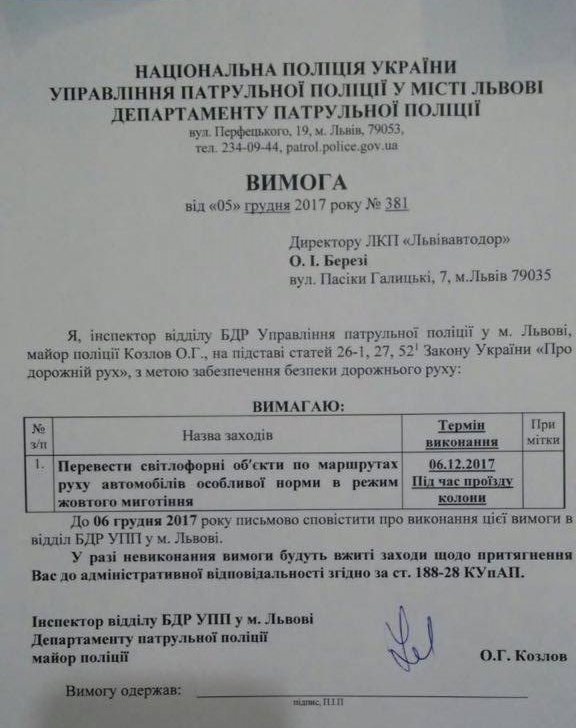 Там же в комментариях Кристина Процак опубликовала фотокопию требования патрульной полиции Львова в "Львовавтодор" об отключении светофоров. Требование подписано инспектором отдела безопасности дорожного движения Управления патрульной полиции Львова майором полиции А. Г. Козловым.
