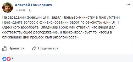 "На заседании фракции БПП поставил Премьер-министру в присутствии Президента вопрос о финансировании работ по реконструкции ВПП Одесского аэропорта. Владимир Гройсман ответил, что вчера дал соответствующее распоряжение, и проконтролирует, чтобы в ближайшие дни процесс был разблокирован", - заявил он.