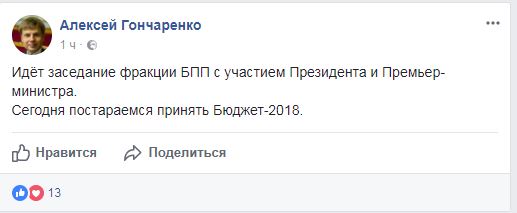 Также Гончаренко добавил, что сегодня БПП стараться способствовать принятию бюджета на 2018 год.