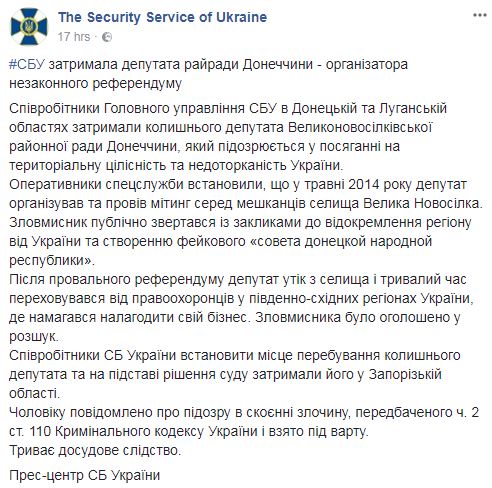 "Сотрудники главного управления СБУ в Донецкой и Луганской областях задержали бывшего депутата Великоновоселковской районного совета Донецкой области, который подозревается в посягательстве на территориальную целостность и неприкосновенность Украины", - говорится в сообщении.