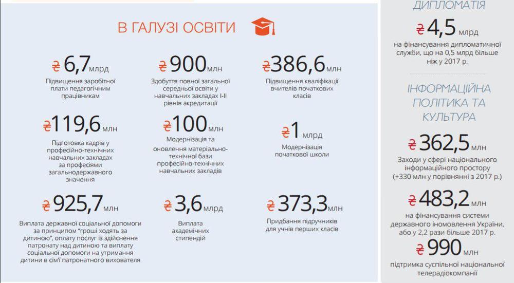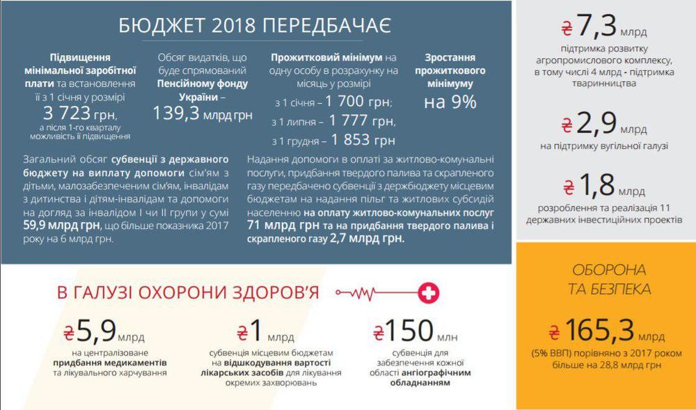 Кабмин опубликовал инфографику, которая показывает основные цифры принятого вчера Радой госбюджета-2018 и на что из него будут расходоваться деньги.