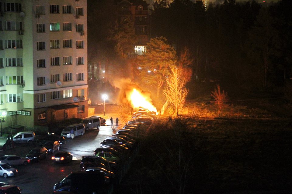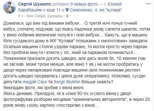 "Дожились, что уже под окнами взрывы... В три ночи услышал громкий взрыв, сначала подумал, что какая-то падла опять салюты шмаляє, потом в окно увидел огромное пламя и новые взрывы... Говорят, что в машину возле соседнего дома в ЖК "Купава" бутылками с "молотовым" забросали. Поскольку машины стояли вдоль забора, то могли просто через забор без проблем бросить и убежать в лес, который за забором начинается", - пишет он.