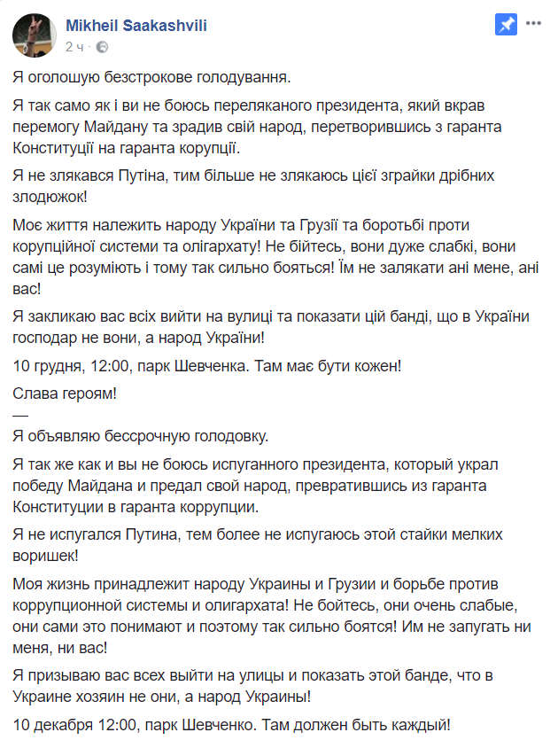 15.59 - Удерживаемый в изоляторе СБУ лидер Руха новых сил Михаил Саакашвили подтвердил у себя в Facebook объявление бессрочной голодовки, а также призвал украинцев выйти на улицы, чтобы "показать этой банде, что в Украине хозяин не они, а народ Украины".