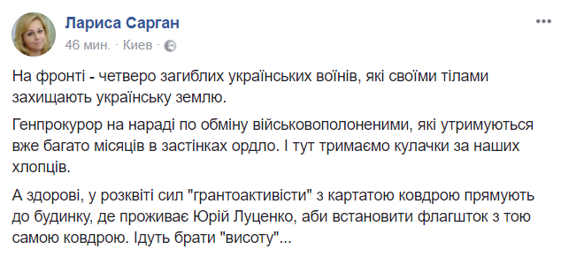 13.12 - Советник Юрия Луценко намекнула активистам "Автомайадана" о том, что пока на фронте гибнут наши солдаты, они здоровые и рассвете сил с одеялом едут к дому Генпрокурора. Об этом написала пресс-секретарь Генерального прокурора Украины Лариса Сарган на своей странице в Facebook.