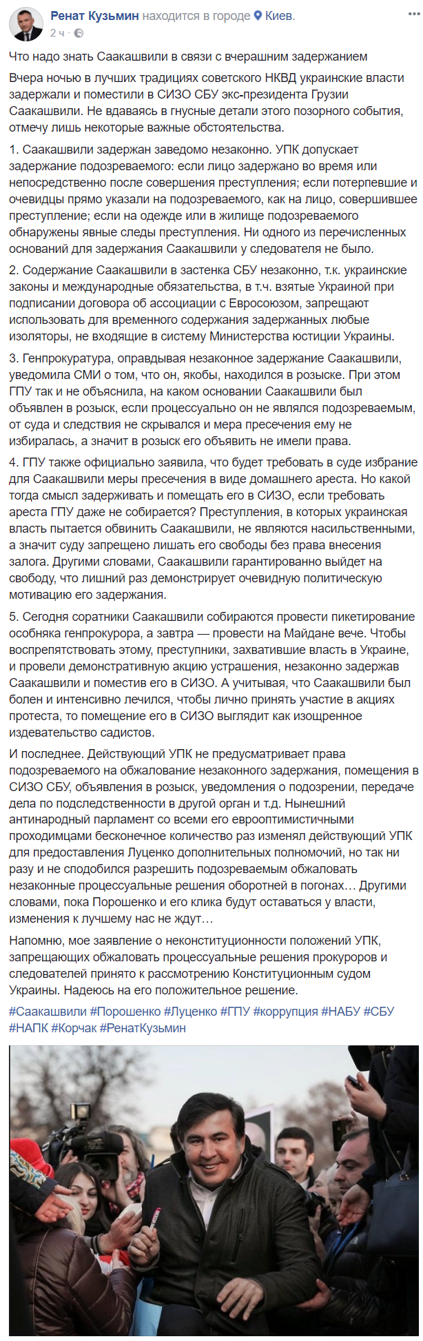 14.31 - Что надо знать Саакашвили в связи с вчерашним задержаниемобстоятельно  изложил у себя в Facebook бывший первый заместитель генерального прокурора Украины Ренат Кузьмин.