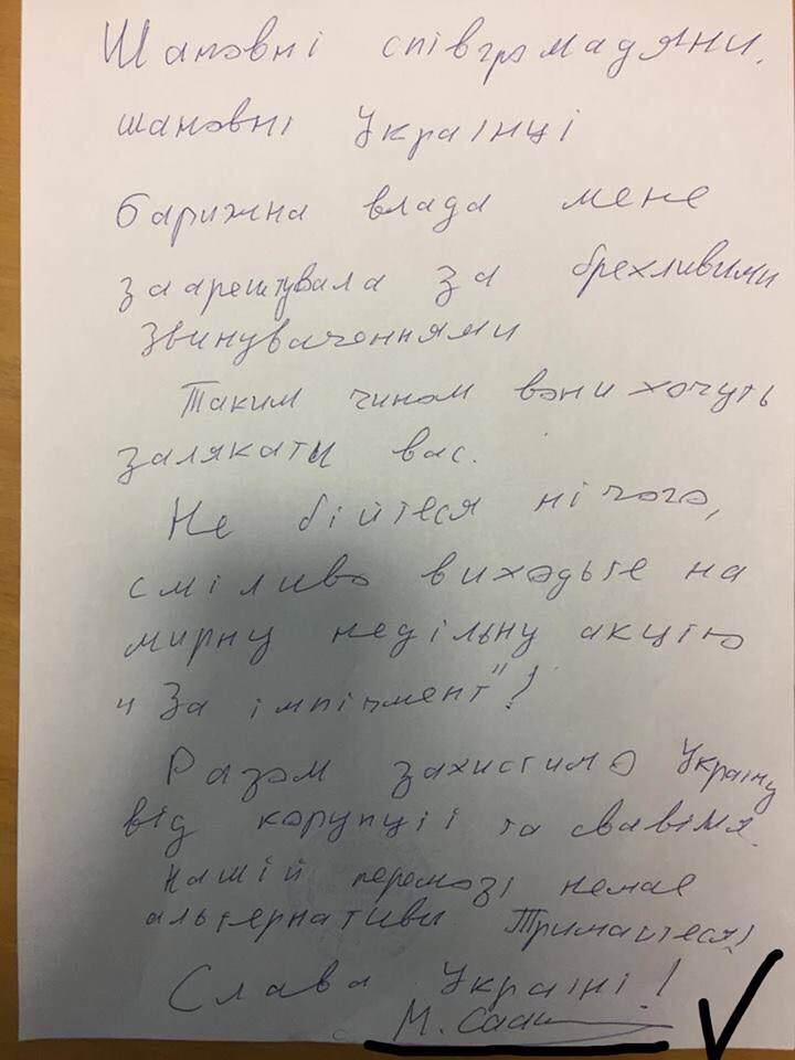 Моя жизнь принадлежит народу Украины и Грузии и борьбе против коррупционной системы и олигархата! Не бойтесь, они очень слабые, они сами это понимают и поэтому так сильно боятся! Им не запугать ни меня, ни вас!", пишет Саакашвили.