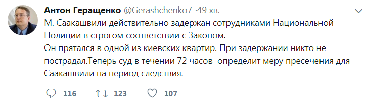 "М. Саакашвили действительно задержан сотрудниками Национальной Полиции в строгом соответствии с Законом", – написал он в своем аккаунте в Твиттер вечером в пятницу.