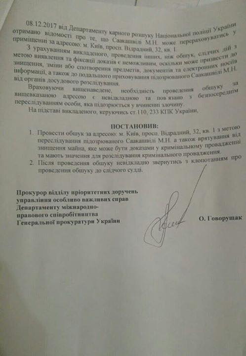 В постановлении отмечается, что 8 декабря Департамент уголовного розыска Нацполиции получил сведения о том, что Саакашвили может скрываться в квартире на проспекте Отрадном. Обосновывая необходимость проведения обыска в постановлении отмечается, что проведение других следственных действий является невозможным из-за риска "уничтожения, изменения или искажения предметов, документов и электронных носителей информации", которые являются доказательствами по делу, а также "дальнейшего сокрытия подозреваемого Саакашвили от органов досудебного расследования", - говорится в сообщении.