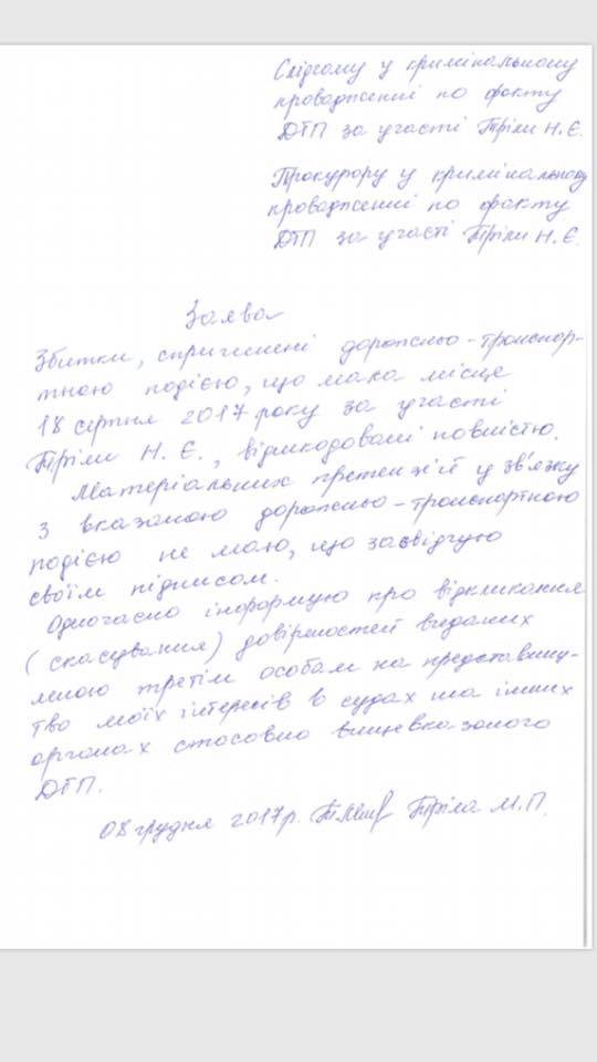 Он также прикрепил заявление матери погибшей Натальи Трилы. В нем сказано, что потерпевшей полностью возместили ущерб, причиненный в результате ДТП.