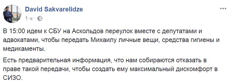 Он написал, что по предварительной информации правоохранители собирались отказать им в праве такой передачи, чтобы создать Саакашвили максимальный дискомфорт в СИЗО.