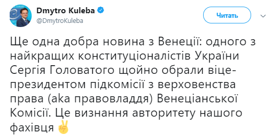 "Еще одна хорошая новость из Венеции: один из лучших юристов Украины Сергея Головатого только избрали вице-президентом подкомиссии по верховенству права Венецианской комиссии. Это международное признание авторитета нашего специалиста", - написал он.