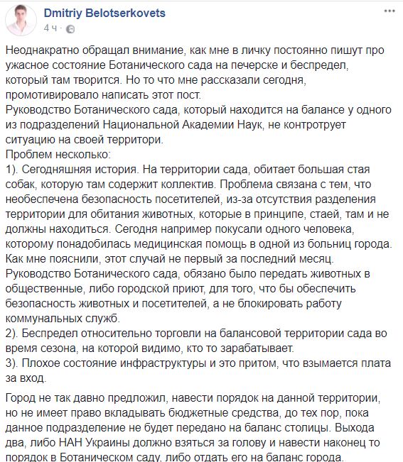 В субботу, 9 декабря, стая собак напала на человека на территории Ботанического сада имени Гришко. Об этом сообщил депутат Верховной Рады Дмитрий Белоцерковец на своей странице в Facebook.