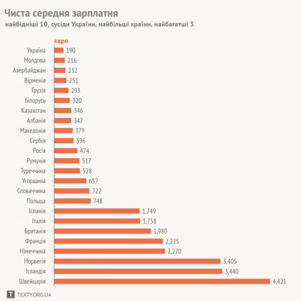 В качестве критерия специалисты выбрали уровень зарплат, изучив заработок жителей европейских стран после выплаты налогов. Выяснилось, что в Украине эта сумма является самой низкой - 190 евро. Второе и третье места занимают Молдова (216 евро) и Азербайджан (232 евро).
