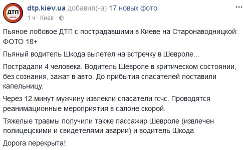 "Пьяный водитель Skoda вылетел на встречку в Chevrolet. Пострадали 4 человека. Водителя Chevrolet в критическом состоянии, без сознания, извлекли спасатели. Проводятся реанимационные мероприятия в салоне скорой", - говорится в сообщении.